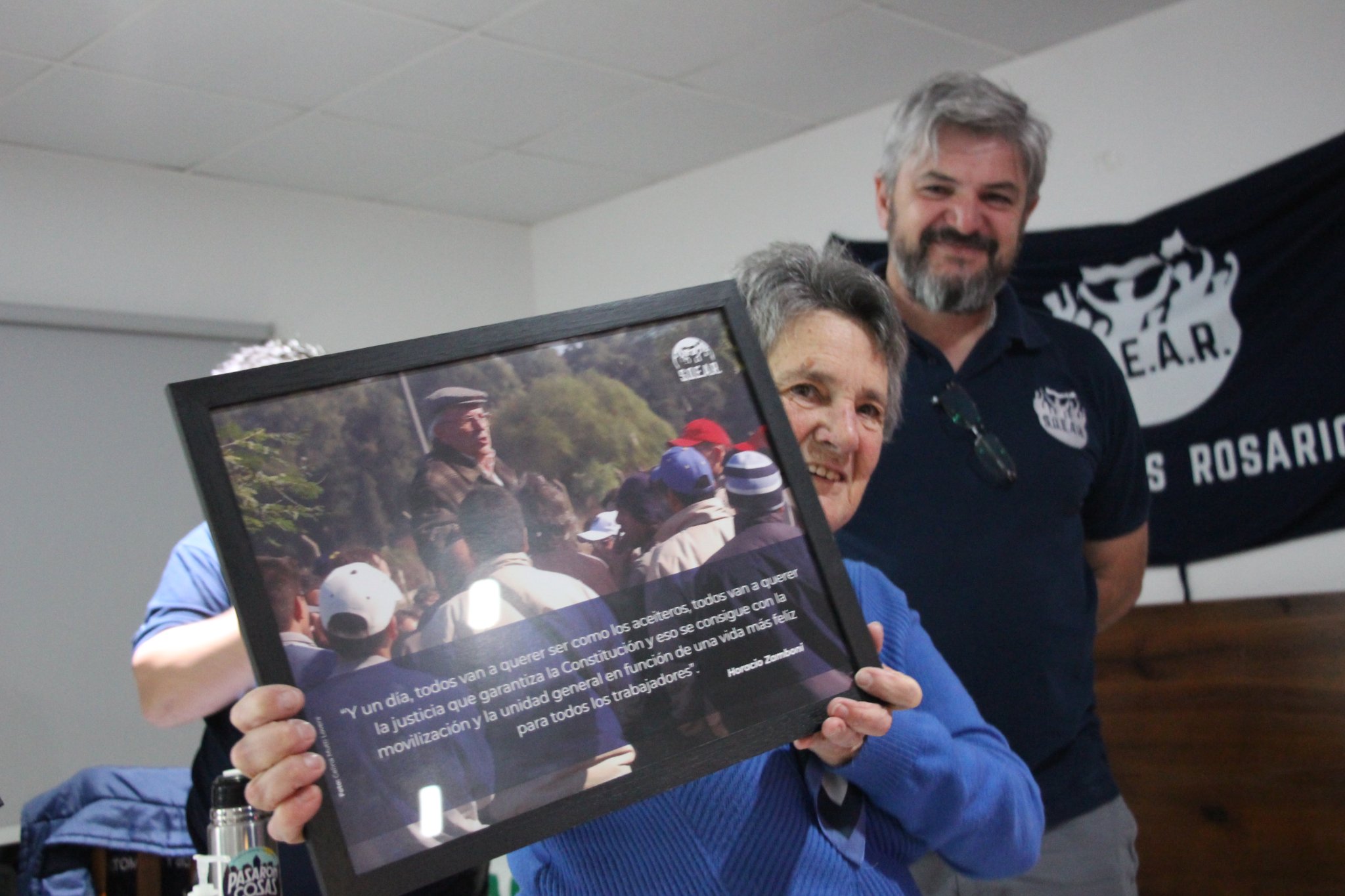 Pero en el exilio continúo peleando, y después cuando regreso volvió a estar a luchar con los petroquímicos del SOEPU, y finalmente junto al SOEAR y a la FEDERACION ACEITERA Y DESMONTADORA, asiendo eje en la pelea por el SMVYM, con herramientas como la Huelga, las asambleas, la solidaridad y la formación”.